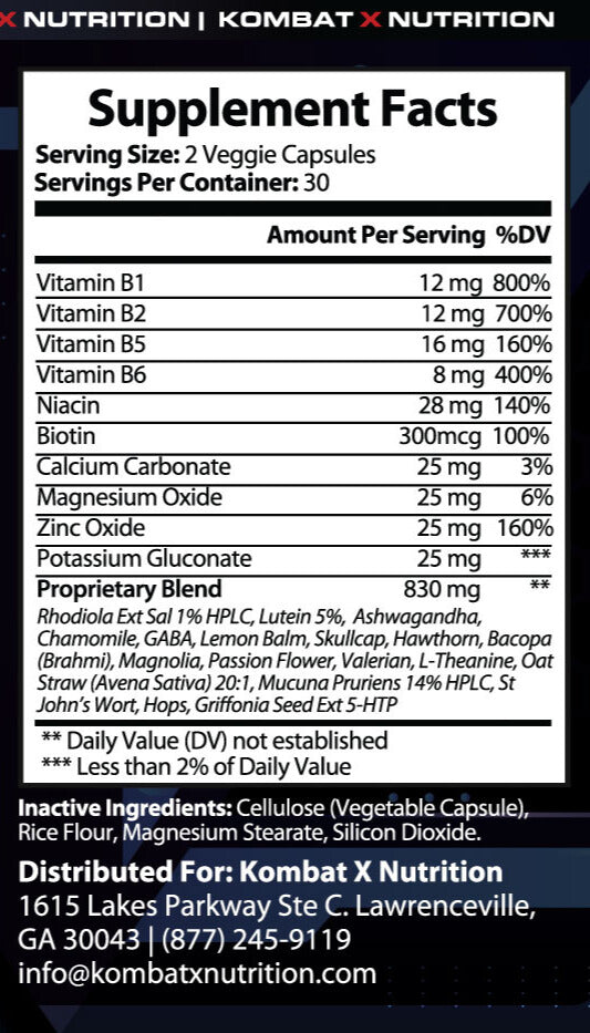 Kombat X Combat Calm is engineered to help you handle stress, sharpen focus, and stay mission-ready when life turns up the heat. This advanced formula combines essential vitamins, calming minerals, and a powerful herbal blend to promote relaxation without slowing you down.