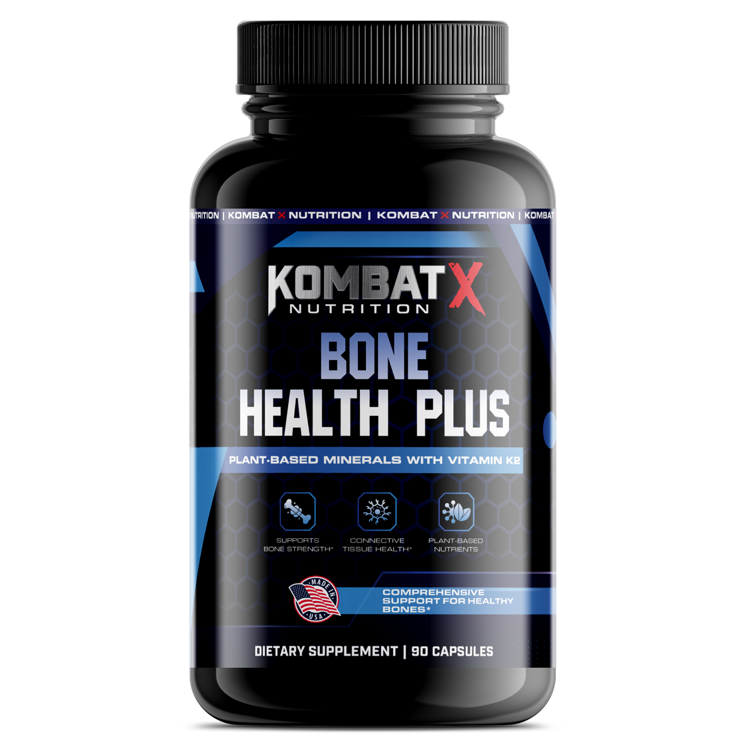 Kombat X Bone Support is engineered to keep your frame strong, resilient, and ready for battle. Powered by Aquamin® red algae for natural calcium and minerals, plus vitamin K2 for bone density, this formula reinforces the structure that carries you through every rep, shift, and mission.