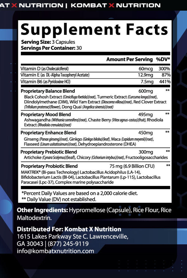 Kombat X Menopause Support is designed to help women stay strong, steady, and resilient through life’s natural transitions. With a powerful blend of botanicals, adaptogens, vitamins, and probiotics, this formula supports hormone balance, mood, energy, and overall wellness—so you can keep moving forward with confidence.