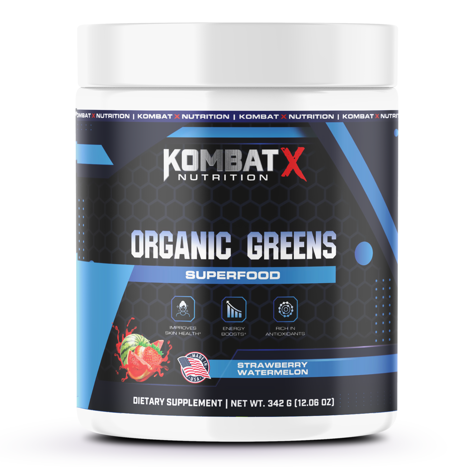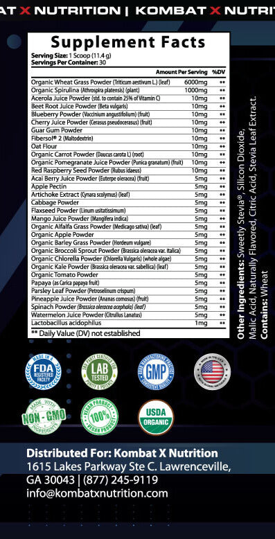 Kombat X Organic Green Superfood is packed with a powerhouse blend of organic greens, fruits, and probiotics to recharge your body and keep you mission-ready. From spirulina and chlorella to wheat grass and kale, every scoop delivers natural energy, gut support, and nutrient-dense recovery fuel.